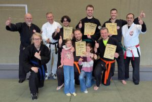 Das war eine sehr sehr familiäre Aktion und wieder einmal einfach besonders! Hier waren Prüfungen zu sehen, von Janina Thümmler zusammen mit Ihren Vater und Prüfungspartner René. Dann Wolfgang Schiebel mit seinem Sohn Lukas. Nicole Schmollinger ist die Tochter von Joachim Schaffrinna (Ihr Mann Holger hat übrigens Fotos gemacht). Sandra Hipp ist die Frau von Volker Hipp und zusammen mit Nadine Reuter hatten wir eine „Bujukai“ Prüfung wo nur Frauen auf der Matte standen. Wir waren 3 Prüfer, Frank Jähne war außerhalb der Family, also keine Vorteile, eher eine harte Vorbereitung!