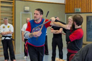 Beim Frühjahrs Dan-Kombilehrgang vom Arnis de Mano Deutschland. Die kleinere Danträgergruppe musste sogar ins Foyer ausweichen. Das Wochenende 31.03. bis 02.04.2023 bot den Teilnehmern eine interessante Mischung von Stock-, Messer und Waffenlosen Techniken aus dem breiten Spektrum des Arnis Kombatan-Systems. Stefan Hodenmacher aus Braunschweig entpuppte sich dabei als exzellenter Kindertrainer. Er hatte schon am Vortag die emmendinger Kindergruppe trainiert und musste am Samstag gleich nochmal ran. … zum Artikel